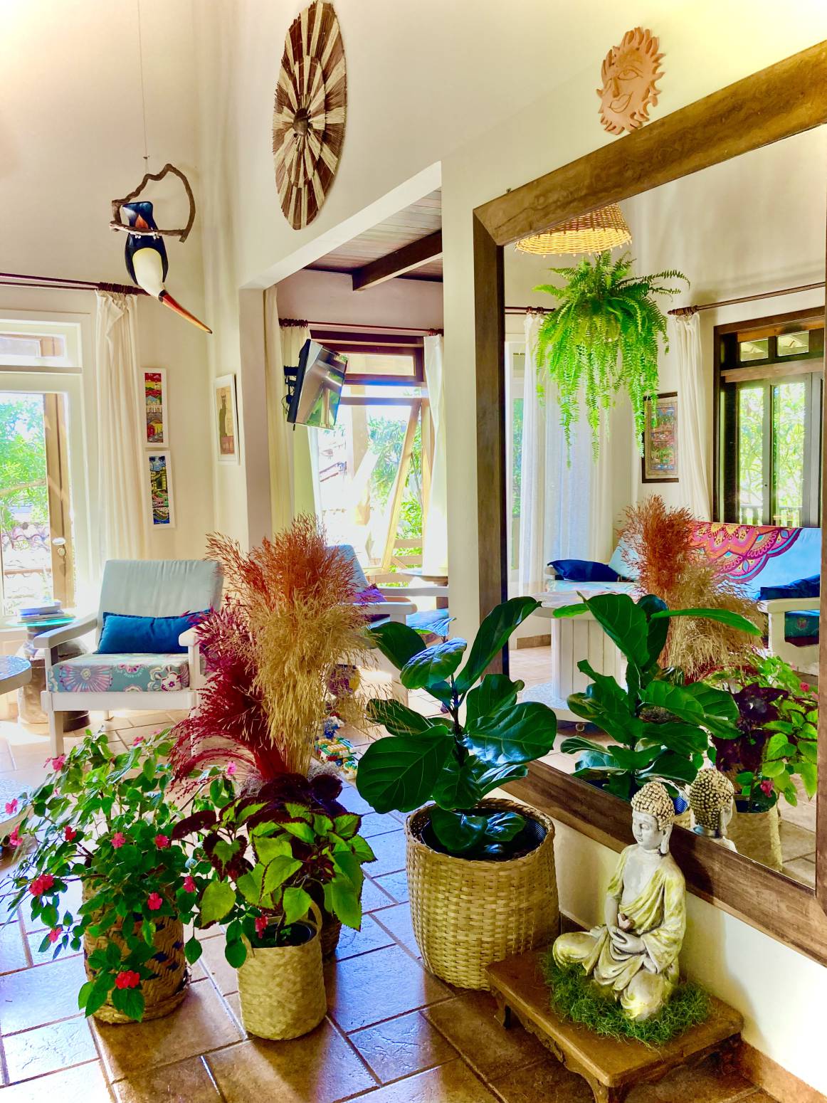 A decoração e a arquitetura é um convite especial para a conexão interior, nela incluímos elementos como bambu, peças em barro (produzidas no nosso Ateliê ), plantas (cultivadas no nosso espaço), tetos de vidro nas varandas, banheiro, cozinha, janelas amplas com total integração com a vegetação externa, muitos cestos em palha (feitos pelos indígenas), móveis em madeira de demolição, peças restauradas, trazidas de ferro velho, imagens de buda saudando a chegada de todos, fonte d’água, elementos sutis trazidos de muitas partes do mundo.